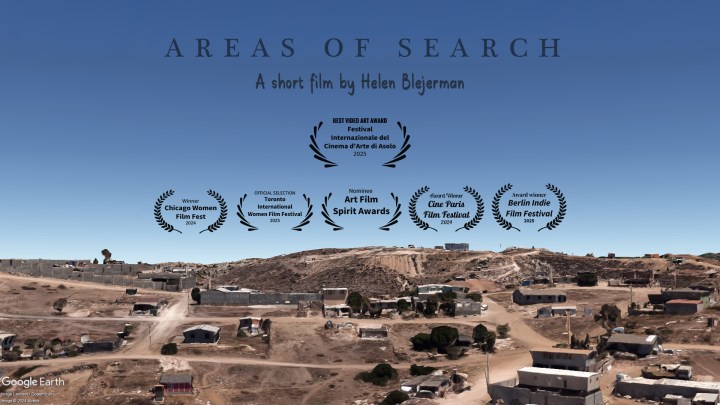 “In Helen Blejerman’s work, Areas of Search, images (from Google Earth) of a Mexico seemingly emptied of human presence flow like a visual carpet, forming the backdrop to the voice (the artist herself) of a soul searching for its remains, thus representing a doubly unreal world. The estrangement is heightened by the water flowing backwards, almost expressing a longing to return to time, to life. The theme of loss, both personal and collective, permeates the work, as does the gaze upon the landscape. For these reasons and the lyricism of its composition, it was awarded the prize for the best video artwork.” Enrico Tomaselli, member of the jury—from the Festival’s catalogue.