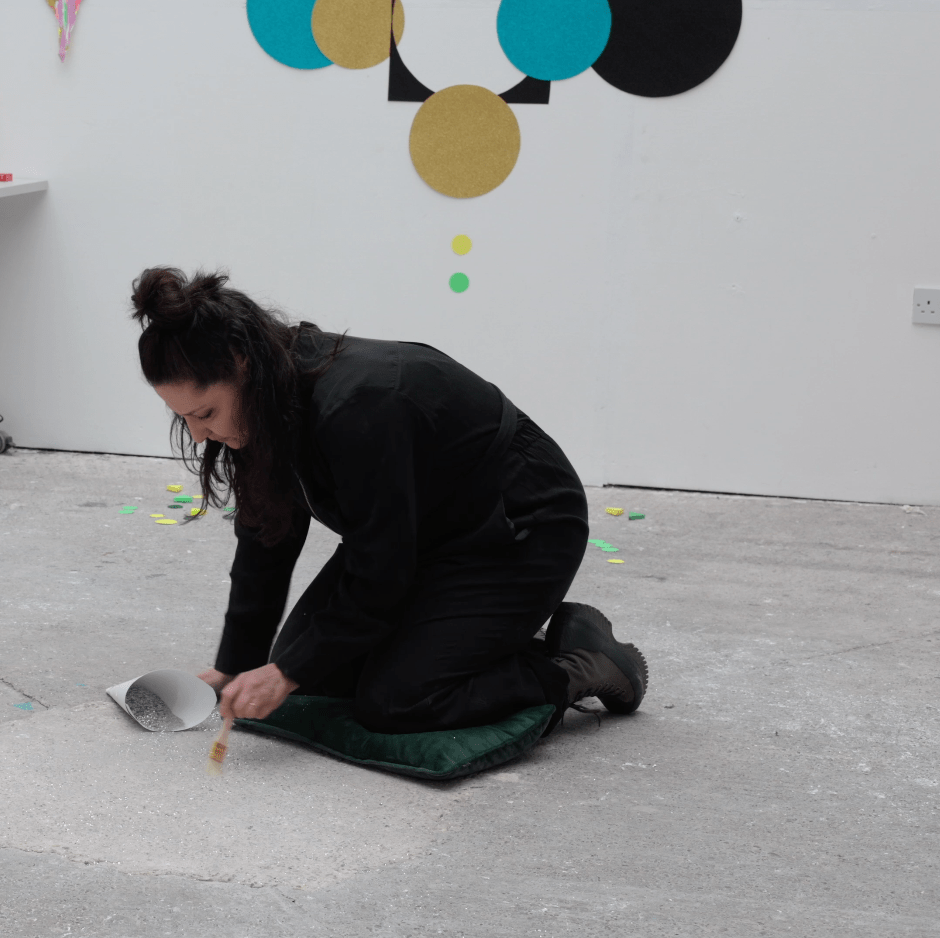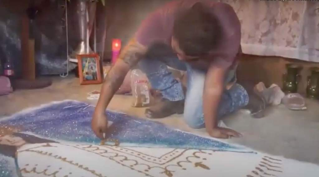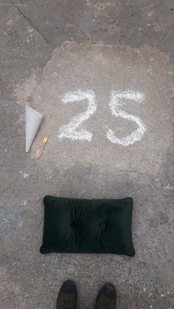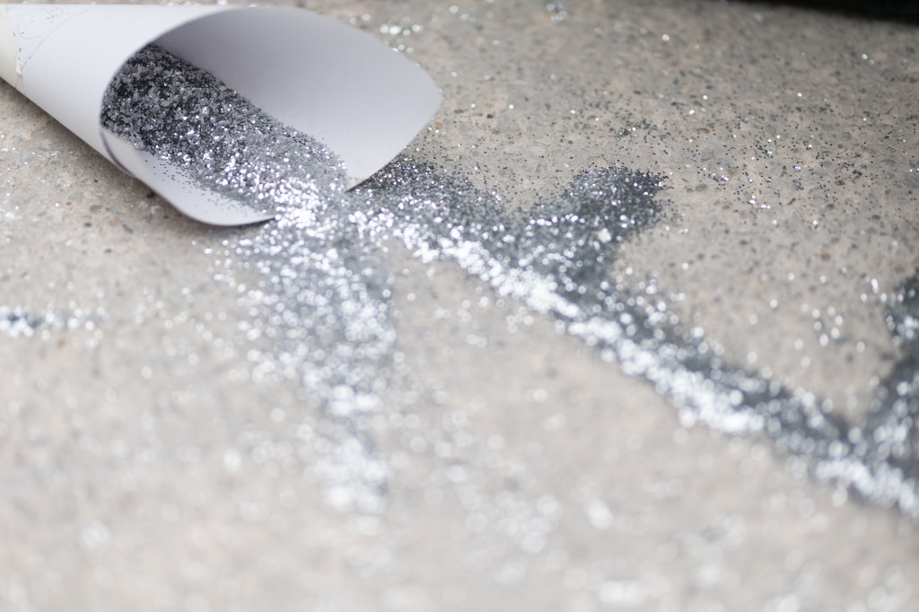 This work draws from a Oaxacan burial tradition in which, after the wake, an artisan arrives to trace the likeness of the deceased (or a religious image) on the floor with glitter and sand. Here, in the artspace, the portrait becomes a sequence of numbers—each one the age of a woman murdered in Mexico. The ages are taken from official records listing names, occupations, and dates of death. One by one, I poured glitter to form each number. When it was complete, I swept it away, trying to erase it. But, as Ian Frazier writes in Gone to New York, “Glitter, in the house, never leaves.”